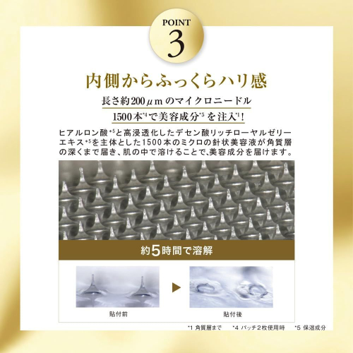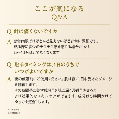 スキンケアの最後に、貼って寝るだけで翌朝ふっくら潤ったハリのある肌に整える針状美容液シートです。
