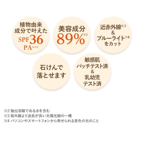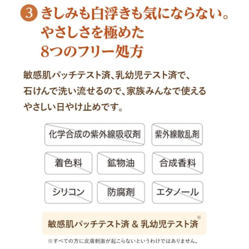 スキンケアをしているように心地よい使用感で、紫外線からお肌を守ると同時に、美容効果も発揮します。環境にもお肌にも優しい処方で、石鹸で簡単に落とせるため、ご家族で一緒にご使用いただけます。