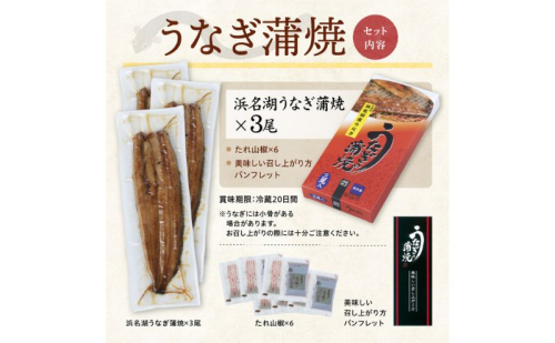 - 浜名湖産うなぎ蒲焼(1尾あたり約140g)×3尾、たれ(12g)・山椒(1g)×6袋