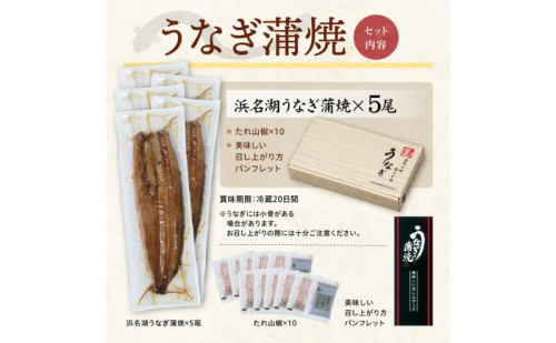 - 浜名湖産うなぎ蒲焼(1尾あたり約140g)×5尾、たれ(12g)・山椒(1g)×10袋