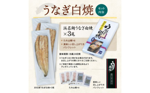 浜名湖産うなぎ白焼(1尾あたり約140g)×3尾、たれ(12g)・山椒(1g)×6袋