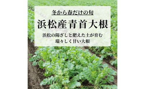 浜松の豊かな土壌と温暖な気候で育つ「浜松産青首大根」は、瑞々しく歯ごたえの良さが自慢で、冬から春にかけて(12月~5月頃)収穫されます。