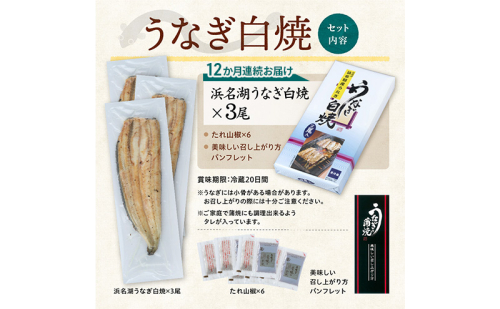 【12か月定期便】浜名湖産 うなぎ白焼 約140g×3尾入り 計12回 うなぎ ウナギ 鰻 ブランドうなぎ 白焼 浜名湖 とろける ふっくら 香ばしい 旨味 肉厚 静岡 浜松市