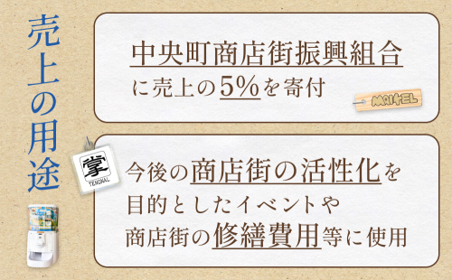 今回の企画では、売上の5%を中央町商店街振興組合に寄付させていただきます。今後、商店街の活性化を目的としたイベントや商店街の修繕費用等に使用させていただきます。