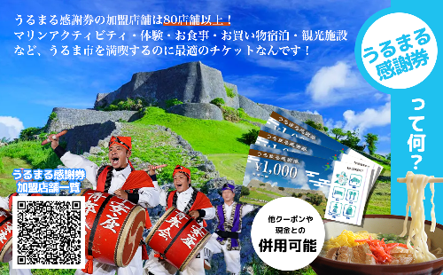 うるま市内の感謝券加盟施設にて利用可能な宿泊・体験・アクティビティ・お食事・お買い物に使えるお買い物チケットです。加盟店舗はうるま市観光におすすめな店舗様ばかり。