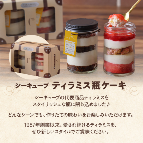 この機会に是非、1987年シーキューブ創業当初から37年以上作り続けている『ティラミス瓶ケーキ(プレーン1個・いちご1個)』ぜひご賞味ください。