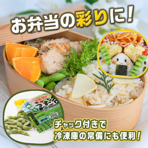 宮崎県都城市近郊で収穫された新鮮な枝豆を、塩ゆでしさっとゆでて急速凍結しました。