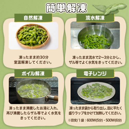 ・ボイル解凍:凍ったままの枝豆を沸騰したお湯に入れ、再び沸騰したらザル等でよく水気をきってください。