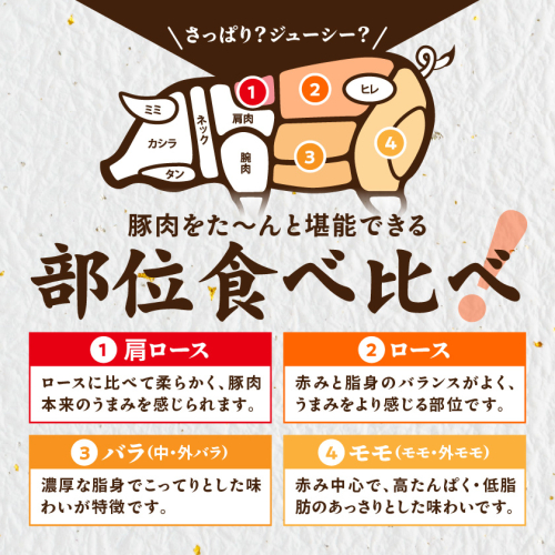 ロースとんかつ、バラ焼肉、肩ローススライス(生姜焼き用)、切り落とし、ロース・バラしゃぶ、全部セットでお届けいたします!