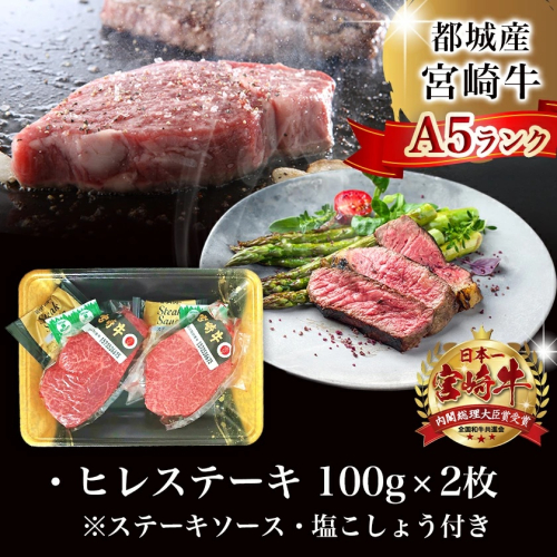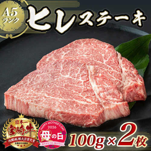 【母の日ギフト対象品】 ~2026年の母の日は5月10日(日)です♪~ 都城産宮崎牛「A5ランク」のヒレステーキ2枚セットです! 100gずつにカットし、真空パックでお届けします。 ヒレは、柔らかくあっさりとした上品な味わいで世代を問わず人気の部位です。「都城」のロゴ入り化粧箱でお届けいたしますので、贈答用にもおすすめです。 ぜひ、都城産宮崎牛をご堪能ください。 ※お召し上がりの前日~半日前に冷蔵室で時間をかけて解凍し、調理前には常温に戻して加熱していただくと火が通りやすく、柔らかく焼き上がります。 【決済について】 ・2026年4月30日(木)までのオンライン決済限定です。 【お届け先について】 ・贈り主は寄附者様のお名前でお届けいたします。(※お届け先と寄附者様のお名前が異なる場合のみ) ・お申し込みの際は、配送情報の入力にご注意ください。