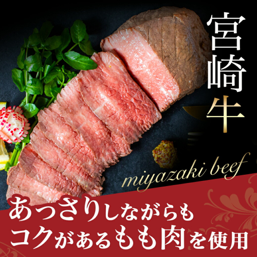 【母の日ギフト対象品】 ~2026年の母の日は5月10日(日)です♪~ 宮崎牛モモ肉を使用し、丹精込めて作っています。製造過程で余分な脂や水分が落ちて体積は縮みますが、その分うまみが凝縮されます。 そのままでも美味しいですが、ローストビーフ丼・サンドイッチ・サラダ等でもお楽しみいただけます。 【決済について】 ・2026年4月30日(木)までのオンライン決済限定です。 【お届け先について】 ・贈り主は寄附者様のお名前でお届けいたします。(※お届け先と寄附者様のお名前が異なる場合のみ) ・お申し込みの際は、配送情報の入力にご注意ください。