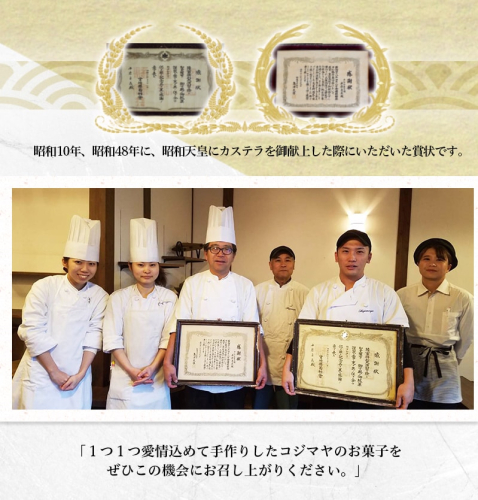 こちらは、昭和10年、昭和48年の二度にわたり、昭和天皇に御献上させていただいたカステラ2斤分のセットになっております。