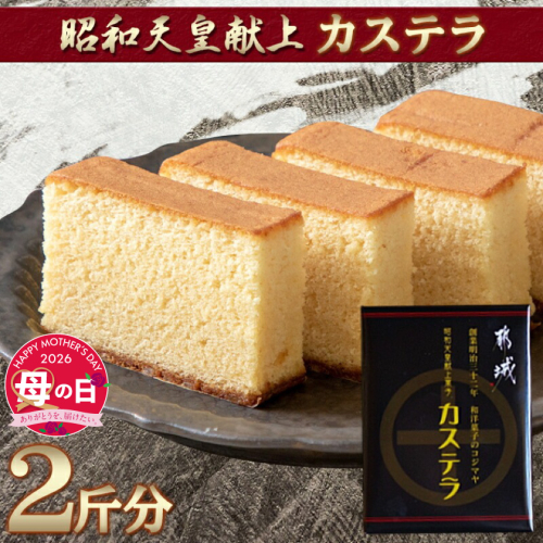 【母の日ギフト対象品】 ~2026年の母の日は5月10日(日)です♪~ 弊社は明治32年(1899年)創業以来、自然の素材を大切に、お客様を第一としたお菓子作りに励んでまいりました。 こちらは、昭和10年、昭和48年の二度にわたり、昭和天皇に御献上させていただいたカステラ2斤分のセットになっております。 宮崎県産の濃厚な鶏卵と、厳選された米飴を使用し、当店が誇るカステラ専用窯にて丁寧に焼き上げています。口の中に広がる米飴の風味と、しっとりとした食感を是非お召し上がりください。 【決済について】 ・2026年4月30日(木)までのオンライン決済限定です。 【お届け先について】 ・贈り主は寄附者様のお名前でお届けいたします。(※お届け先と寄附者様のお名前が異なる場合のみ) ・お申し込みの際は、配送情報の入力にご注意ください。