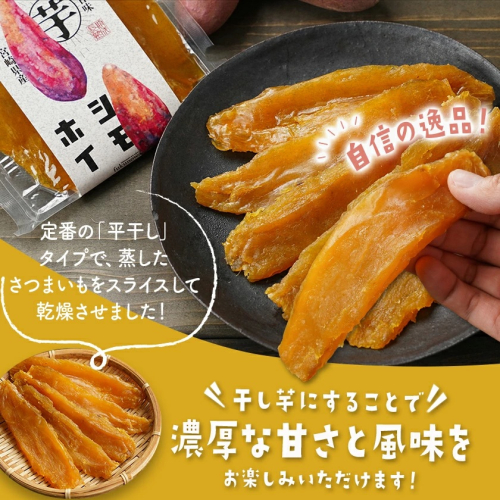 ねっとりした食感と濃厚な甘さが特長の「熟成紅はるか」。定番の「平干し」タイプで、蒸したさつまいもをスライスして乾燥させました。干し芋にすることで、さらに濃厚な甘さと風味を存分にお楽しみいただけます。