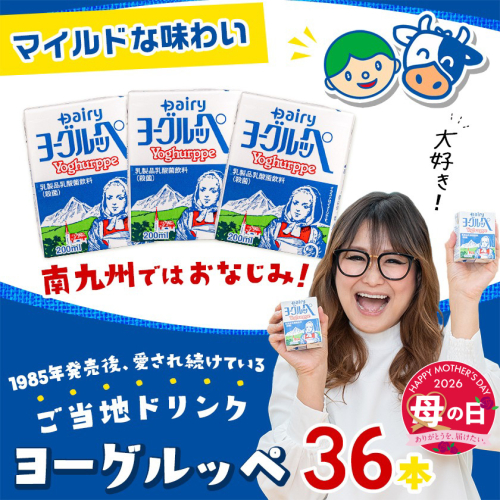 小さいお子様からご年配の方まで、皆様に愛されている「ヨーグルッペ」。 昔ながらのプレーン味をたっぷり飲みたい!というご要望にお応えしてプレーン味2ケース(36本)をお届けします! マイルドな味わいの乳製品乳酸菌飲料(殺菌)です。 【決済について】 ・2026年4月30日(木)までのオンライン決済限定です。 【お届け先について】 ・贈り主は寄附者様のお名前でお届けいたします。(※お届け先と寄附者様のお名前が異なる場合のみ) ・お申し込みの際は、配送情報の入力にご注意ください。