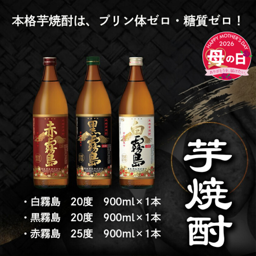 【母の日ギフト対象品】 ~2026年の母の日は5月10日(日)です♪~ 本格芋焼酎は、プリン体ゼロ・糖質ゼロ! ・白霧島は、芋本来のどしっとしたコクとふくよかな香り。 ・黒霧島は、黒麹の醸し出すトロッとした甘み・キリっとした後切れ。 ・赤霧島は、ポリフェノールの華やかで彩りのある甘みと香り。 都城が誇る、霧島酒造の焼酎を3本セットでお届けします。 【決済について】 ・2026年4月30日(木)までのオンライン決済限定です。 【お届け先について】 ・贈り主は寄附者様のお名前でお届けいたします。(※お届け先と寄附者様のお名前が異なる場合のみ) ・お申し込みの際は、配送情報の入力にご注意ください。