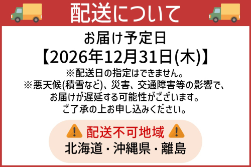 ※悪天候(積雪など)、災害、交通障害等の影響で、お届けが遅延する可能性がございます。ご了承の上お申し込みください。