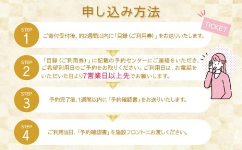 (2)「目録(ご利用券)」に記載の予約センターにご連絡をいただき、ご希望利用日のご予約をお取りください。ご利用日は、お電話をいただいた日より7営業日以上先でお願いします。