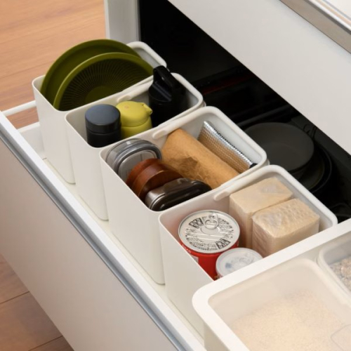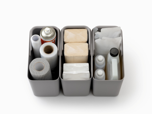 飲料水や缶詰、防災用の備蓄品、ランチグッズといった小物の収納に便利なハンドル付きケース。