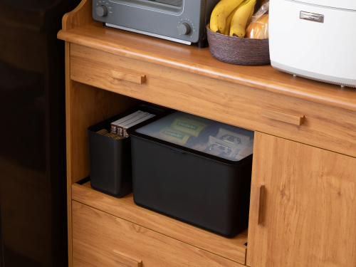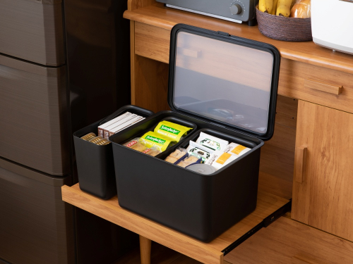 飲料水や缶詰、防災用の備蓄品、ランチグッズといった小物の収納に便利なハンドル付きケース。