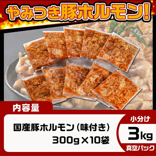 国産豚の良質なホルモンを使用した本格派の味付きホルモンを、真空・小分け包装で10パック、合計3kgお届けします。