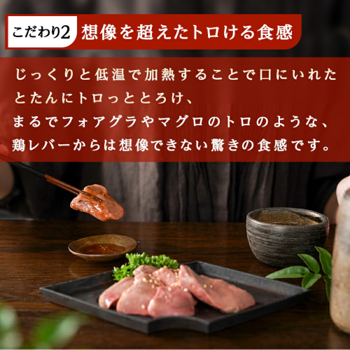 じっくりと低温で加熱することで口にいれたとたんにトロっととろけ、まるでフォアグラやマグロのトロのような、鶏レバーからは想像できない驚きの食感です。