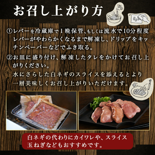 低温調理レバーを冷蔵庫で1晩保管、もしくは流水で10分程度レバーがやわらかくなるまで解凍し、ドリップをキッチンペーパーなどでふき取ってからお皿に盛り付け、解凍したタレをかけてお召し上がりください。