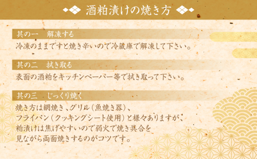 3.焼き方は網焼き、グリル(魚焼き器)、フライパン(クッキングシート使用)と様々ありますが、酒粕漬け味噌漬けともに焦げやすいのでどれも弱火で焼き具合を見ながら両面焼きするのがコツです。