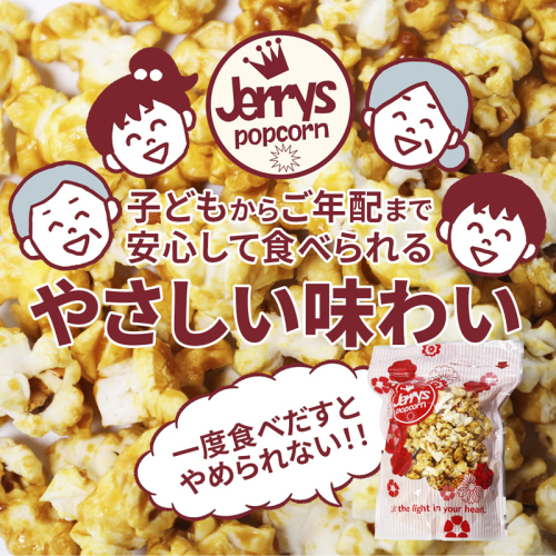 ジェリーズポップコーンでは、合成着色料を一切使用せず、素材本来の色合いと体にやさしいおいしさを大切にした製法を採用しています。キャラメルやチョコレートなどの甘いフレーバーは、冷やすことでカリカリ・さくさくとした食感に変化し、ひと味違う楽しみ方もおすすめです。