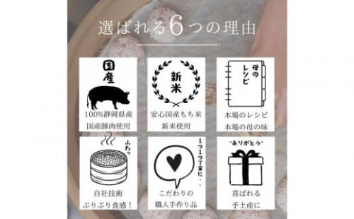 原材料:静岡県産豚肉、国産もち米、干し椎茸、砂糖、塩、オイスターソース、片栗粉、卵、中華だし粉末、生姜、胡椒、こんにゃく粉/調味料(アミノ酸)、(一部に、卵、乳成分、大豆、鶏肉、牛肉を含む)