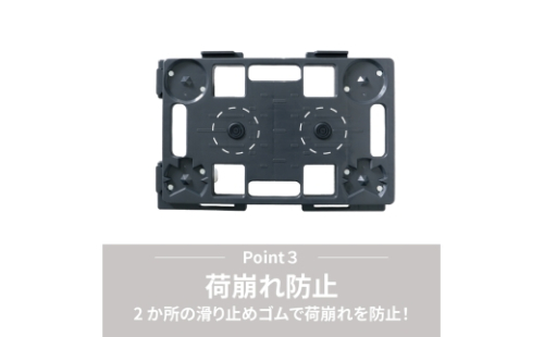 【説明】 1.荷物の大きさに合わせ、タテ、ヨコに連結が可能 2.耐荷重120kg 3.荷崩れ防止の滑り止め(2個)付き 4.使用しない時は、4種類の積み重ね保管が可能 【配送不可地域】 北海道、沖縄、離島 【地場産品基準】 3号:区域内において、樹脂板の成形加工から組立、検査、梱包、出荷により、約55.3%の付加価値が生じているもの。