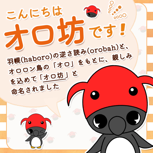 羽幌(haboro)の逆さ読み(orobah)と、オロロン鳥の「オロ」をもとに、親しみを込めて「オロ坊」としました。