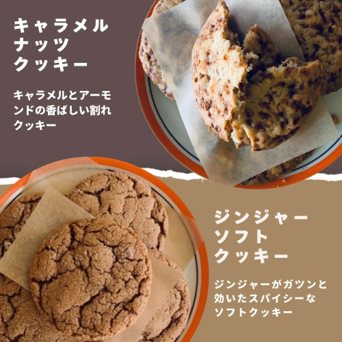 マカダミアチャンククッキー×2枚、ダブルチョコチャンククッキー×2枚、キャラメルナッツクッキー約40g×2袋、ジンジャーソフトクッキー×2枚