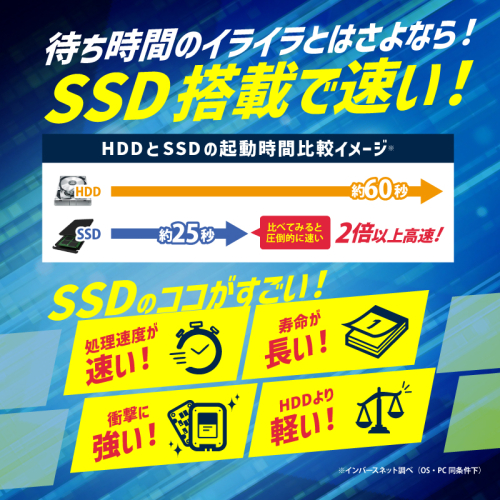 起動が速くデータアクセスの快適な新品SSD 240GB搭載で、作業効率が大幅に向上しストレスなく使えます。