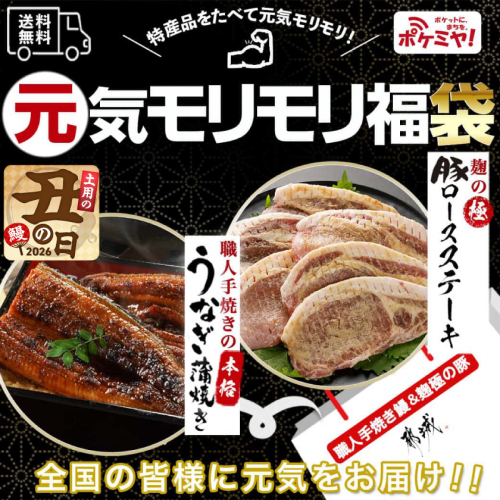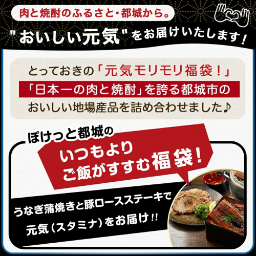 「ぽけっと都城」より、いつもよりたっぷり欲張り!な「職人手焼きうなぎ蒲焼き2尾&豚ロースステーキ6枚」です。