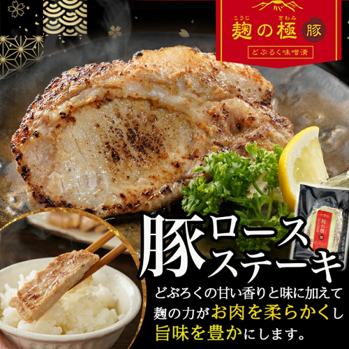 麹の極豚ロースステーキは、丁寧に丁寧に育てられた豚を自然のままの麹の力で、じっくりじっくり寝かせて作ったコクと旨味の麹・味噌漬けです。どぶろくを加えた味噌で豚のロース肉を包み込みました。どぶろくの甘い香りと味に加え、麹の成分の力がお肉を柔らかくし、旨味を豊かにします。