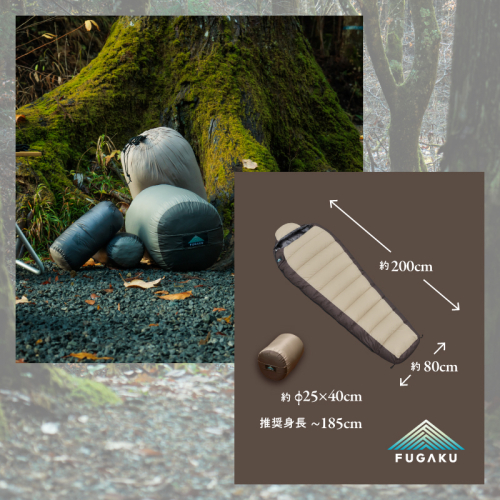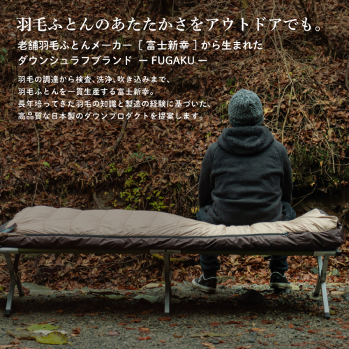 アウトドアシーンに羽毛布団のあたたかさを届ける「FUGAKU」のマミー型寝袋 650g