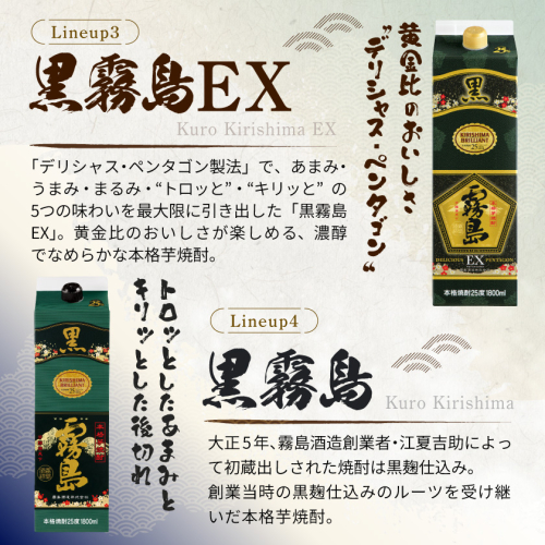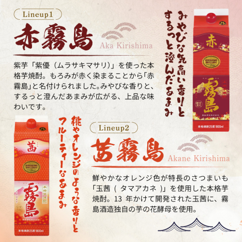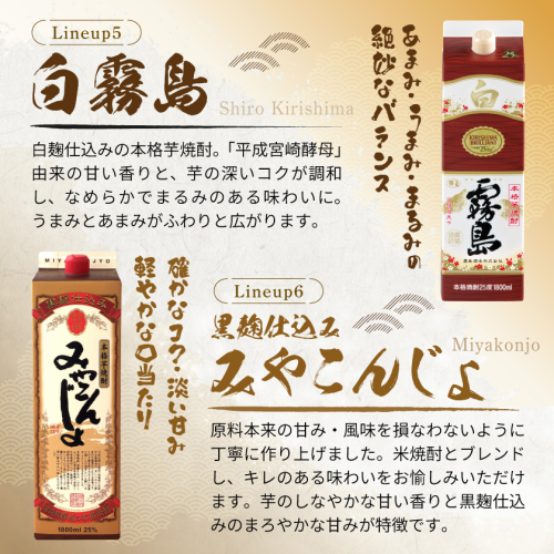 本格芋焼酎の飲みごたえのある25度の1.8Lパック6種6本セットをお届けします♪ ◆気高い香りと澄んだ甘みが特徴の『赤霧島25度』 ◆桃やオレンジのような香りとフルーティーなあまみ気高い香りと澄んだ甘み 『茜霧島25度』 ◆あまみ・うまみ・まるみ、そして黒霧島がもつ「トロッと」「キリッと」『黒霧島EX25度』 ◆黒麹のトロッとしたあまみ、キリッとした後切れ。都城市が誇る、霧島酒造の代表銘柄 『黒霧島25度』 ◆南九州のシラス台地で育ったサツマイモ・黄金千貫と、霧島連山の清冽な地下水・霧島裂罅水で造る白麹仕込みの 『白霧島25度』 ◆原料本来の甘み、風味を仕立てるよう丁寧に作り上げ黒麹によって飲みやすい都城酒造の代表銘柄 『みやこんじょ黒25度』 ロック・炭酸割、その他様々なアレンジでお楽しみいただけます。