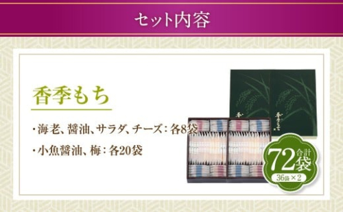 国産米を使用し、蒸し・搗き・寝かしの行程を丁寧に行い、強火で一気に焼き上げた香季もち(醤油・サラダ・海老・チーズ・小魚醤油・梅)を詰合せました。
