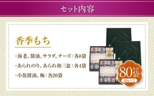 国産米を使用し、蒸し・搗き・寝かしの行程を丁寧に行い、強火で一気に焼き上げた香季もち(醤油・サラダ・海老・チーズ・小魚醤油・梅)と、強火で一気に煎ったあられ(あられのり・あられ和三盆)を詰合せました。