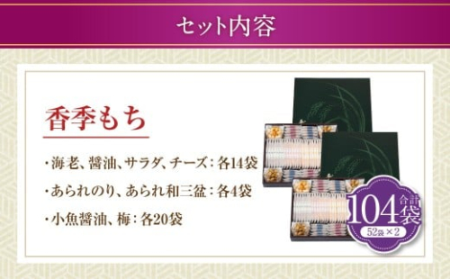 国産米を使用し、蒸し・搗き・寝かしの行程を丁寧に行い、強火で一気に焼き上げた香季もち(醤油・サラダ・海老・チーズ・小魚醤油・梅)と、強火で一気に煎ったあられ(あられのり・あられ和三盆)を詰合せました。