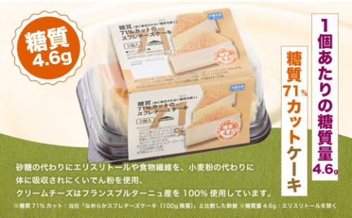 1個当たりの糖質を4.6g(エリスリトールを除く)に抑え、当社「なめらかスフレチーズケーキ(100g換算)」と比較して糖質を71%カットしました。