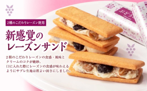 2種のこだわりレーズンの食感・風味とクリームのコクが絶妙な山梨限定・新感覚のレーズンサンドです。
