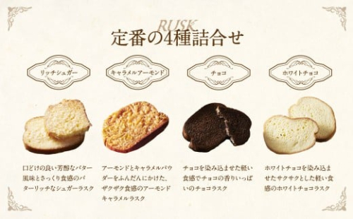 ホワイトチョコを染み込ませた軽い食感の『ホワイトチョコラスク』の定番の4品を詰合せました。