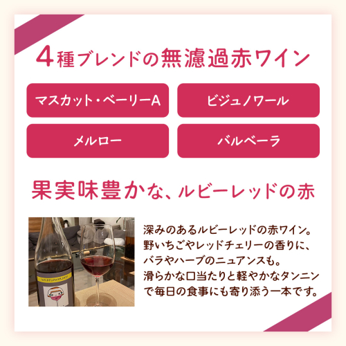 マスカット・ベーリーA、ビジュノワール、メルロー、バルベーラ4種がブレンドされた無濾過ワインです。