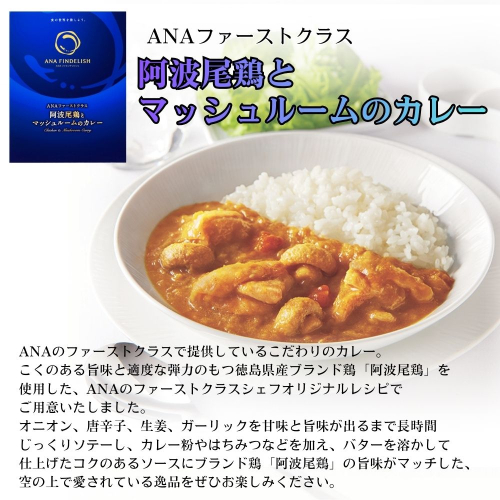 ANA国際線のファーストクラスでご提供している阿波尾鶏とマッシュルームのカレー3個、ANAの全クラス機内食を担当するシェフ監修のビーフカレー1個、チキンカレー1個、ポークカレー1個の計6個が入ったセットです。