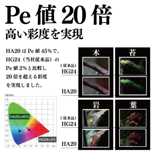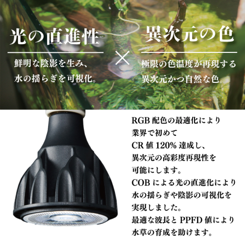 RGB配色の最適化により業界で初めてCR値120%達成し、異次元の高彩度再現性を可能にします。COBによる光の直進化により水の揺らぎや陰影の可視化を実現しました。最適な波長とPPFD値により水草の育成を助けます。