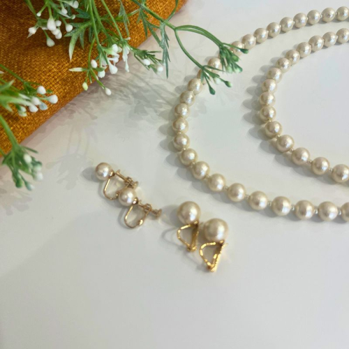 - コットンパール「ホワイト」ロングネックレス(金具ゴールド)とイヤリング2点セット | 結婚式 二次会 パーティー 入学式 卒業式 華やか