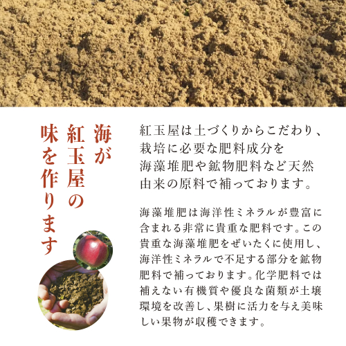 土づくりにも妥協はありません。海洋性ミネラルが豊富な海藻堆肥や鉱物肥料など、天然由来の原料を贅沢に使用しています。化学肥料では補えない有機質や優良な菌類が土壌環境を改善し、果樹に活力を与えることで、力強く美味しい果物が育ちます。自然の恩恵と研鑽された技術が作り上げた自慢の紅玉を、ぜひご賞味ください。