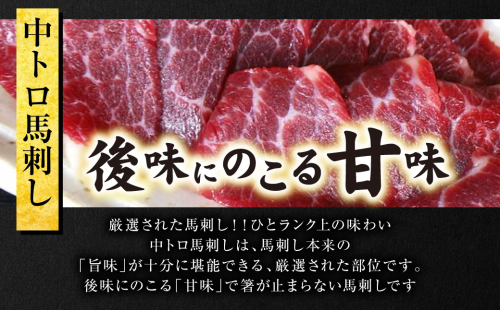 厳選された馬刺し!!ひとランク上の味わい 中トロ! 中トロ馬刺しは、馬刺し本来の「旨味」が十分に堪能できる、厳選された部位です。 後味にのこる「甘味」で箸が止まらない馬刺しです。 ■産地 カナダ、フランス、日本のいずれか ■と畜場 熊本中央食肉センター ■地場産品基準該当理由 熊本県で共通の地域資源として認定されている馬肉を使用しています。 ■原材料名 馬肉(カナダ産/フランス産/国産) ■保存方法 要冷凍(-18℃以下)